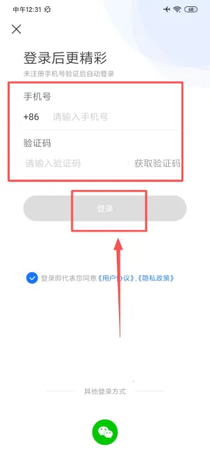 2、在该页面填写手机号及验证码,勾选协议后点击登录完成。