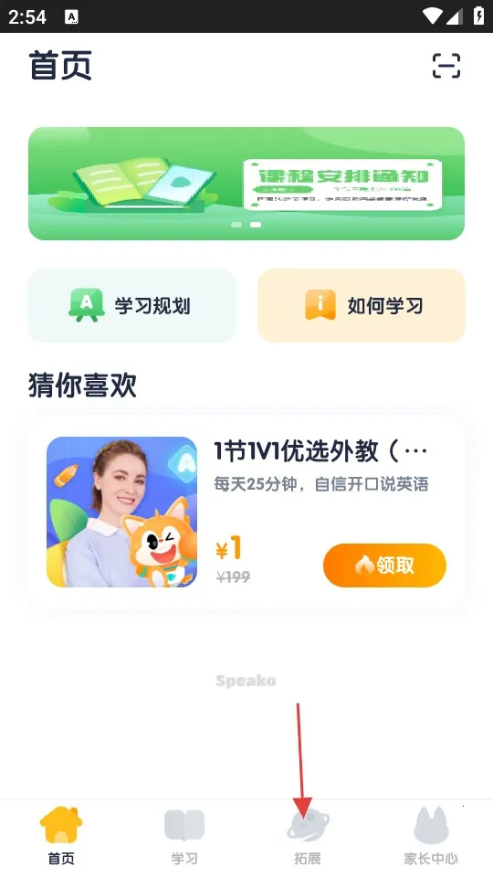 1、点击底部导航栏的【拓展】选项,进入拓展功能页面,可查看各类拓展学习板块。