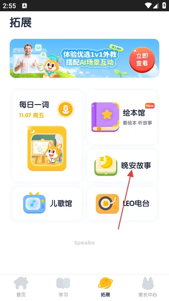 2、在拓展页面点击【晚安故事】选项,进入晚安故事板块,可选择不同故事内容。