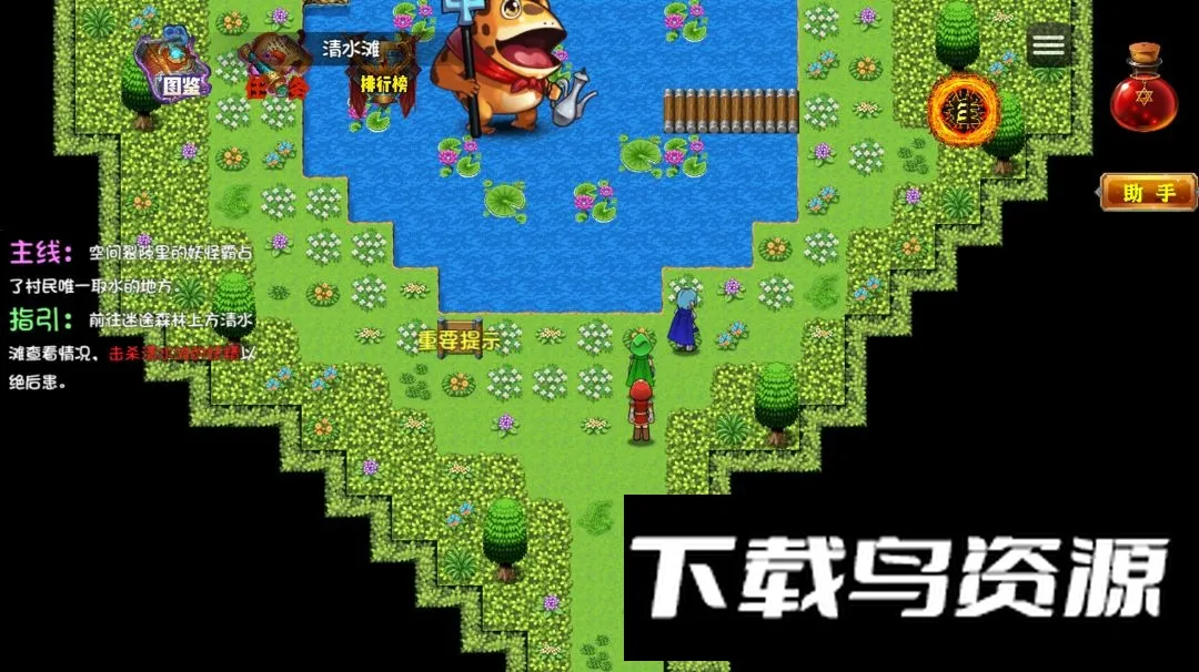 4. 在清水滩协助村民化解危机,此处可招募第二位角色南宫媚儿,她是一名刺客型英雄;击败蛤蟆怪物可获得附带二段伤害的武器,随后返回森林与老人交谈,进入下方的村庄。