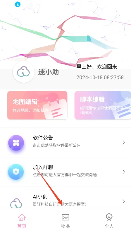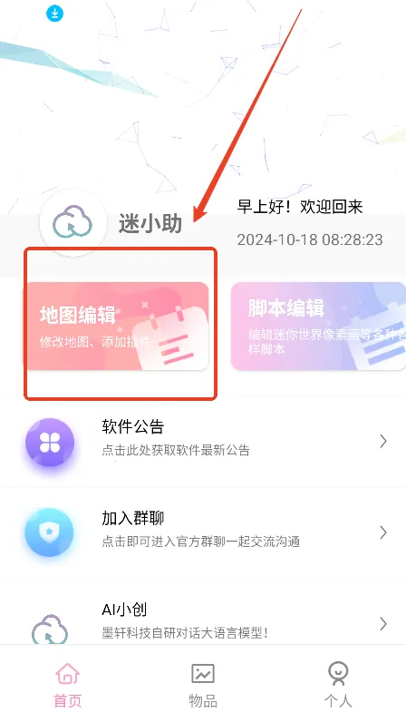 迷小助2026是针对迷你世界的正版游戏助手。可编辑修改存档、查询代码。有物品制作添加、皮肤定制等功能,界面炫酷,资源丰富,支持多版本,提供教程,背包制作、插件中心等亮点助力玩家畅玩。